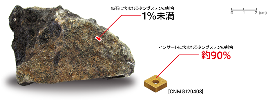 抽出するには”精錬”という作業を行いますが、その鉱石に含まれるタングステンの割合は1 %未満。